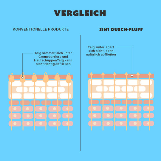 Viele konventionelle Produkte geben ein direkt gepflegtes und weiches Hautgefühl durch kritische Inhaltsstoffe, die die Haut eigentlich austrocknen. Der 3in1 Dusch-Fluff enthält nur unbedenkliche Inhaltsstoffe und pflegt die Haut natürlich.