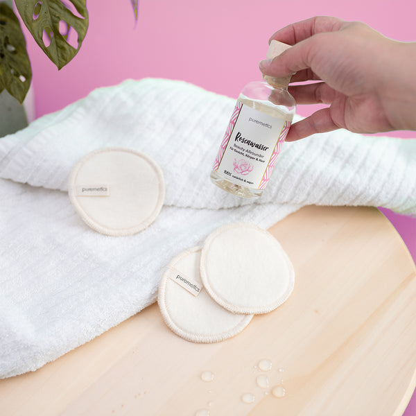 Anwendung als Reinigung: Trage etwas Rosenwasser mit einem Pad auf dein gereinigtes Gesicht auf und reinige es sanft.